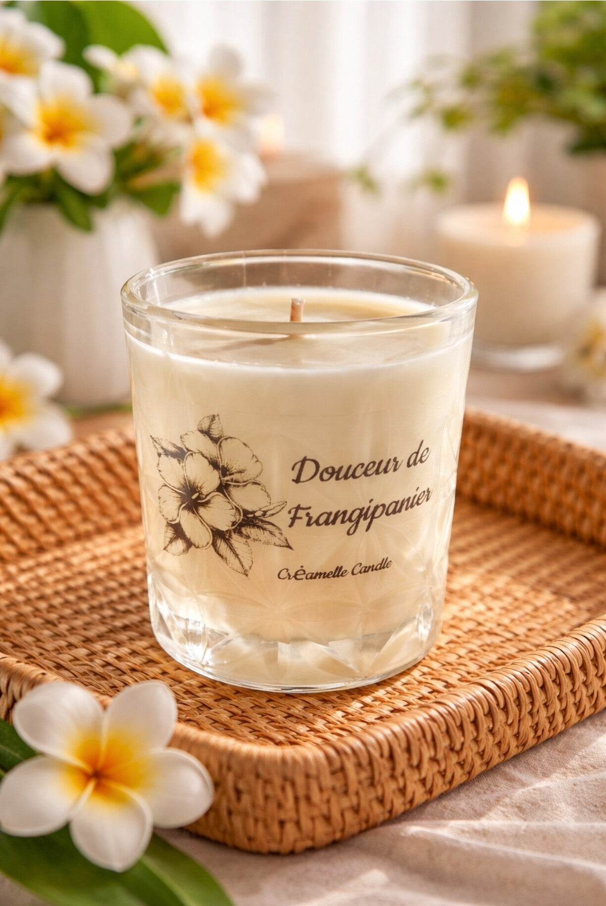 230g de douceur, fragrance de Grasse Frangipanier. Cire végétale de soja, sans additif.
